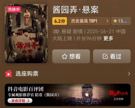 在月活更高、用户画像更多元的抖音,《酱园弄·悬案》的热度一度高达2亿,可结果呢?开分还不是只有区区的6.2。
