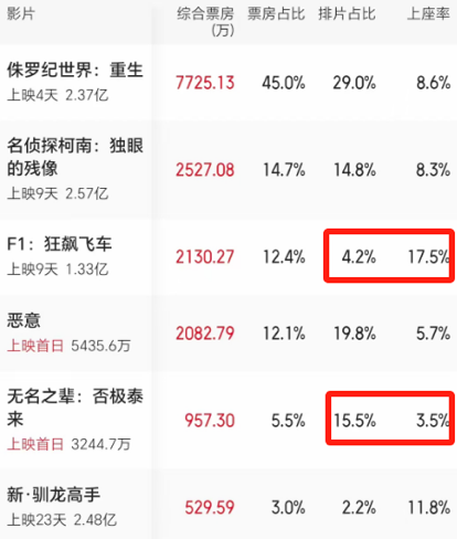 《无名之辈2》上映首日,排片15.5%,仅次于《侏罗纪世界:重生》和《恶意》,但上座率是单日票房前十中最差的一部。布拉德·皮特主演的《F1:狂飙飞车》,排片只有4.2%,但上座率是《无名之辈2》的5倍,当日票房则是它的两倍还要多。