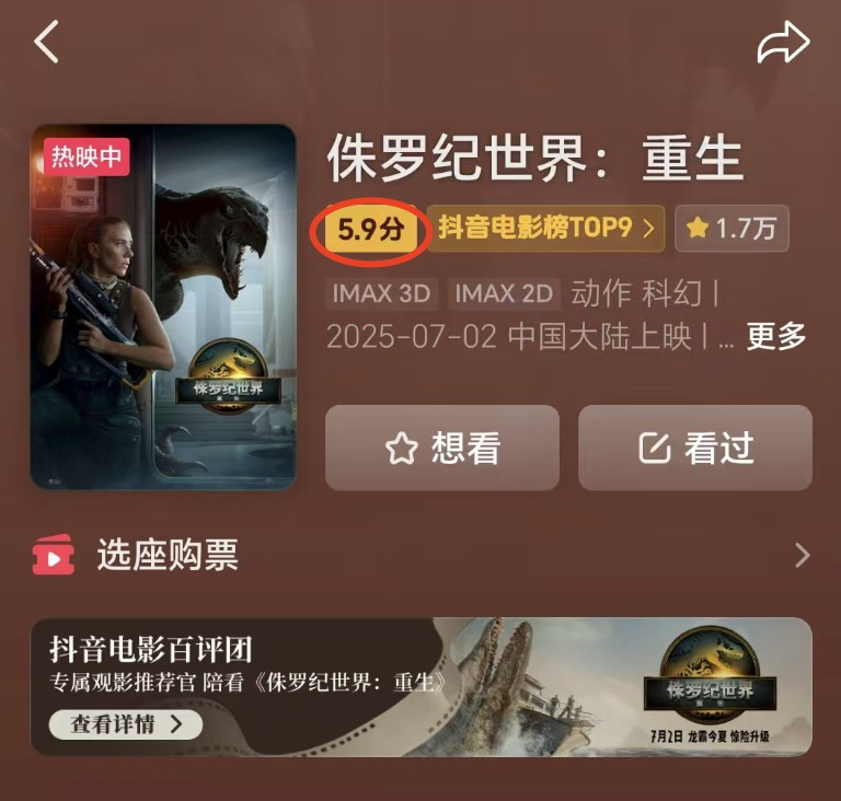 口碑方面,《侏罗纪世界:重生》表现一般,豆瓣评分6.1,抖音评分则还要稍低一些,只有5.9,但均分6分,对于一部爆米花恐龙片来说,已基本够用,不会太过影响票房。