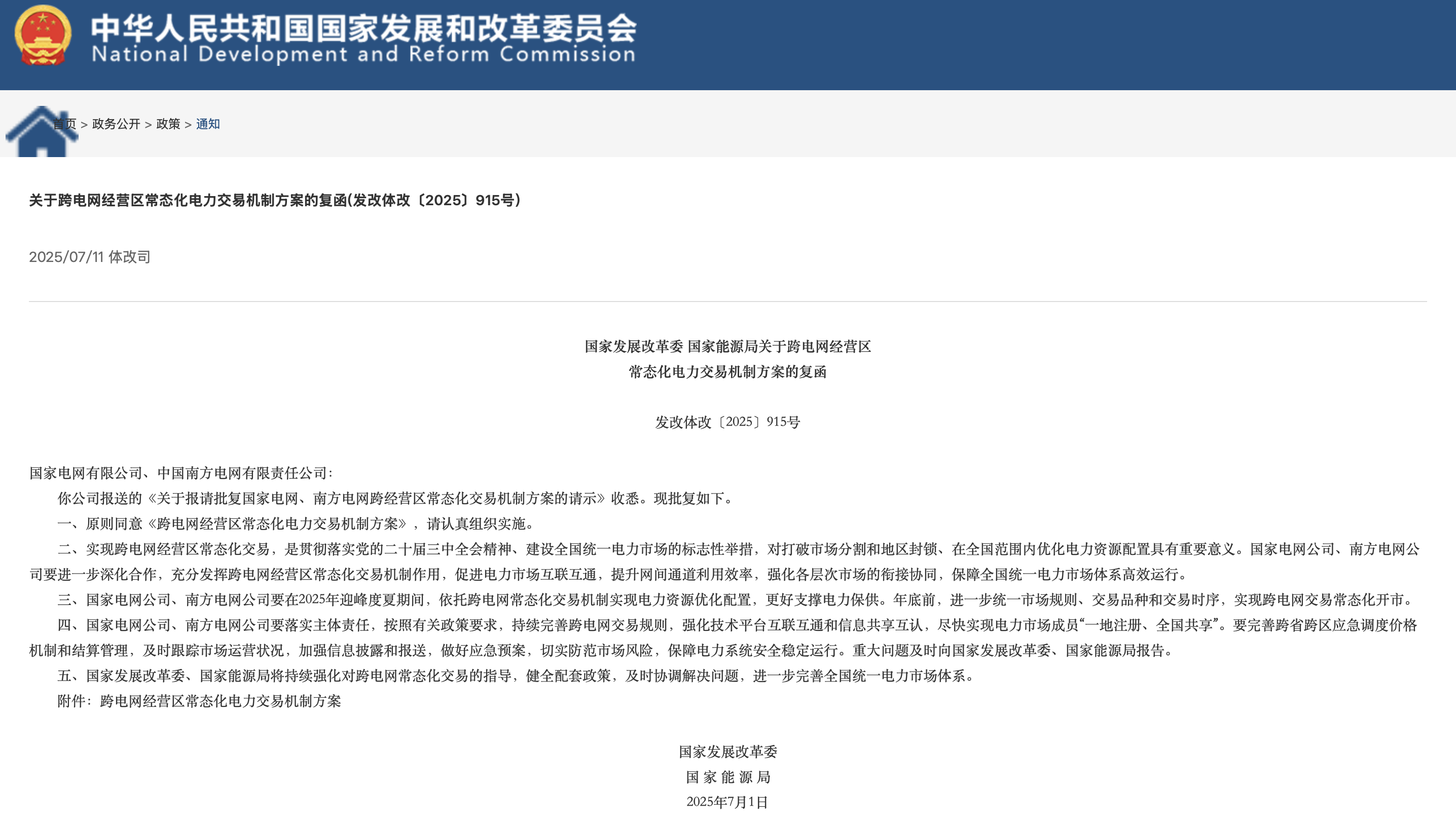 7月11日,国家发展改革委、国家能源局发布《关于跨电网经营区常态化电力交易机制方案的复函》。