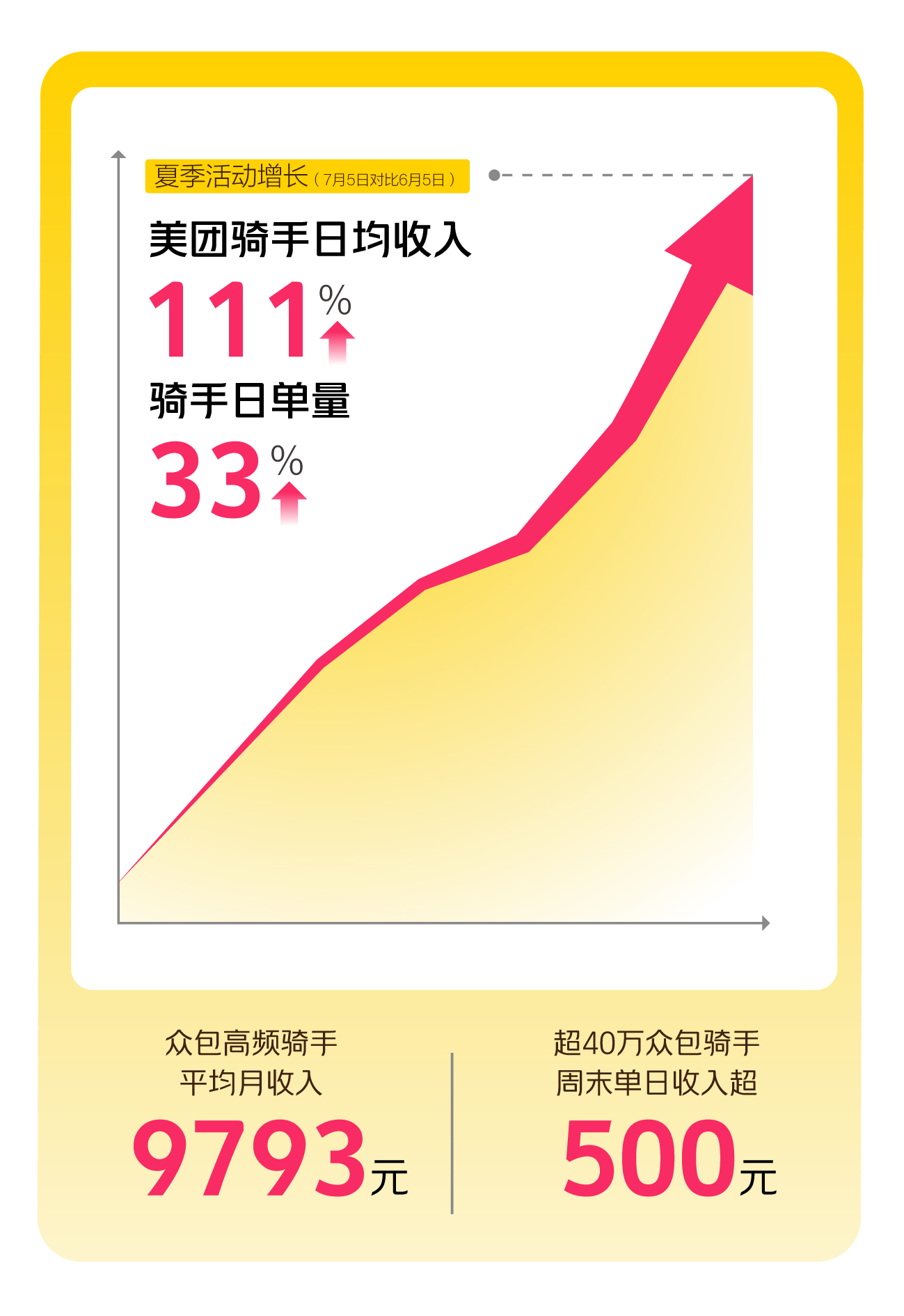 当日,美团再次披露一组骑手相关数据:随着7月接连迎来订单峰值,骑手单量和收入双双稳增,以7月周末为例,骑手日收入增长111%,日单量增长33%,超40万众包骑手日收入超500元。此外,6月期间,全国众包高频骑手月收入达9793元。