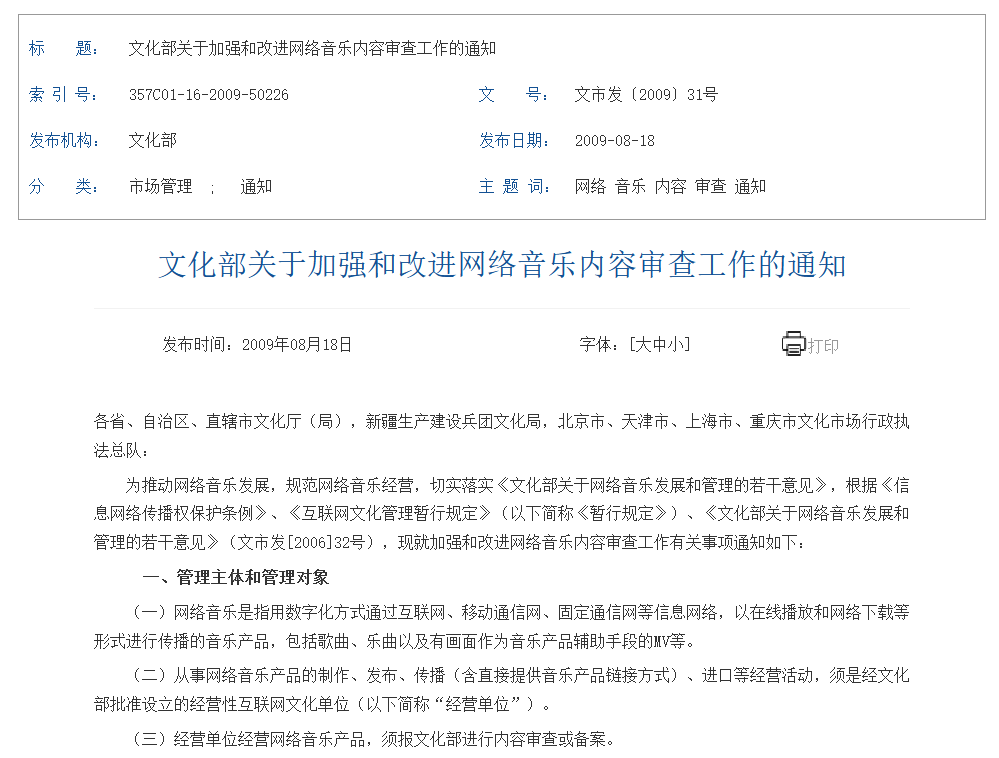 来到2009年,文化部印发《文化部关于加强和改进网络音乐内容审查工作的通知》,为音乐行业带来了第一次大洗牌。