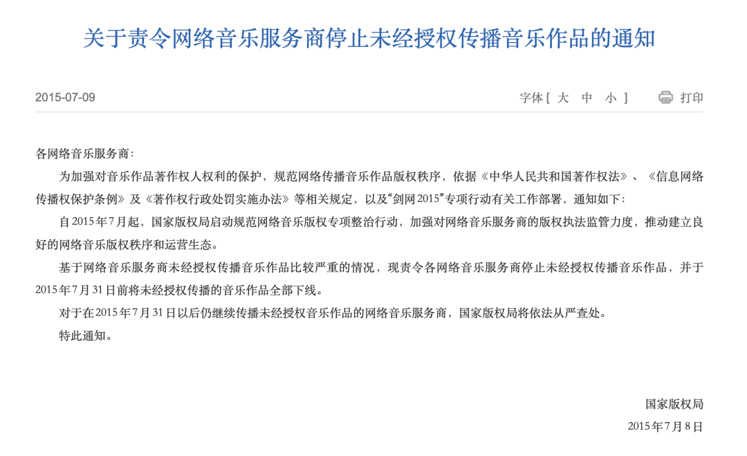 2015年,国家版权局下发《关于责令网络音乐服务商停止未经授权传播音乐作品的通知》,并要求7月31日前将未经授权传播的音乐作品全部下线,否则国家版权局将依法从严查处。