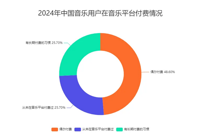 不过,根据《2024年中国音乐行业发展状况与消费行为调查》报告,当前付费用户虽已成为数字音乐平台的重要组成,但整体比例仍偏低:48.6%的用户仅“偶尔付费”,真正具有长期付费习惯的用户仅占25.7%,而另有25.7%的用户从未为音乐内容付费。