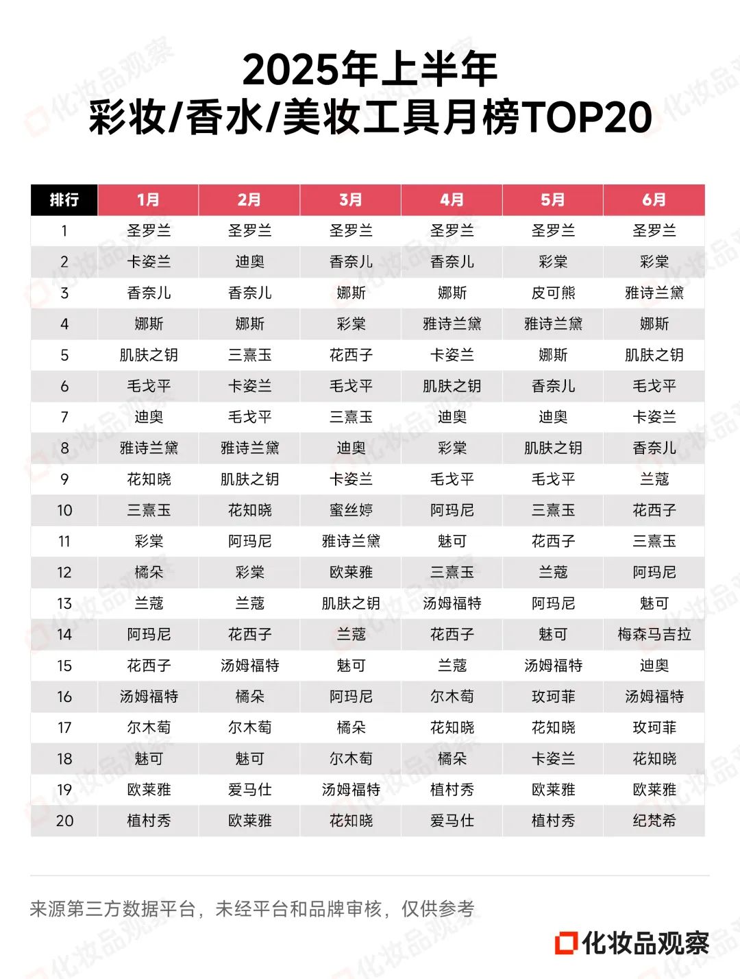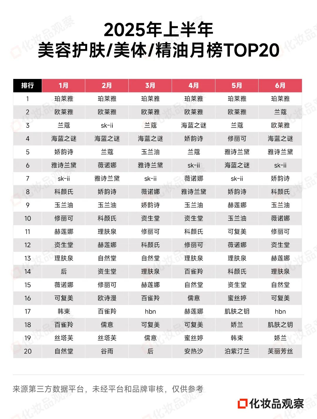除珀莱雅外,欧莱雅和兰蔻亦稳定发挥,位列榜单第二和第三名。1-6月,这两大品牌大部分时候都在月榜TOP3之列。