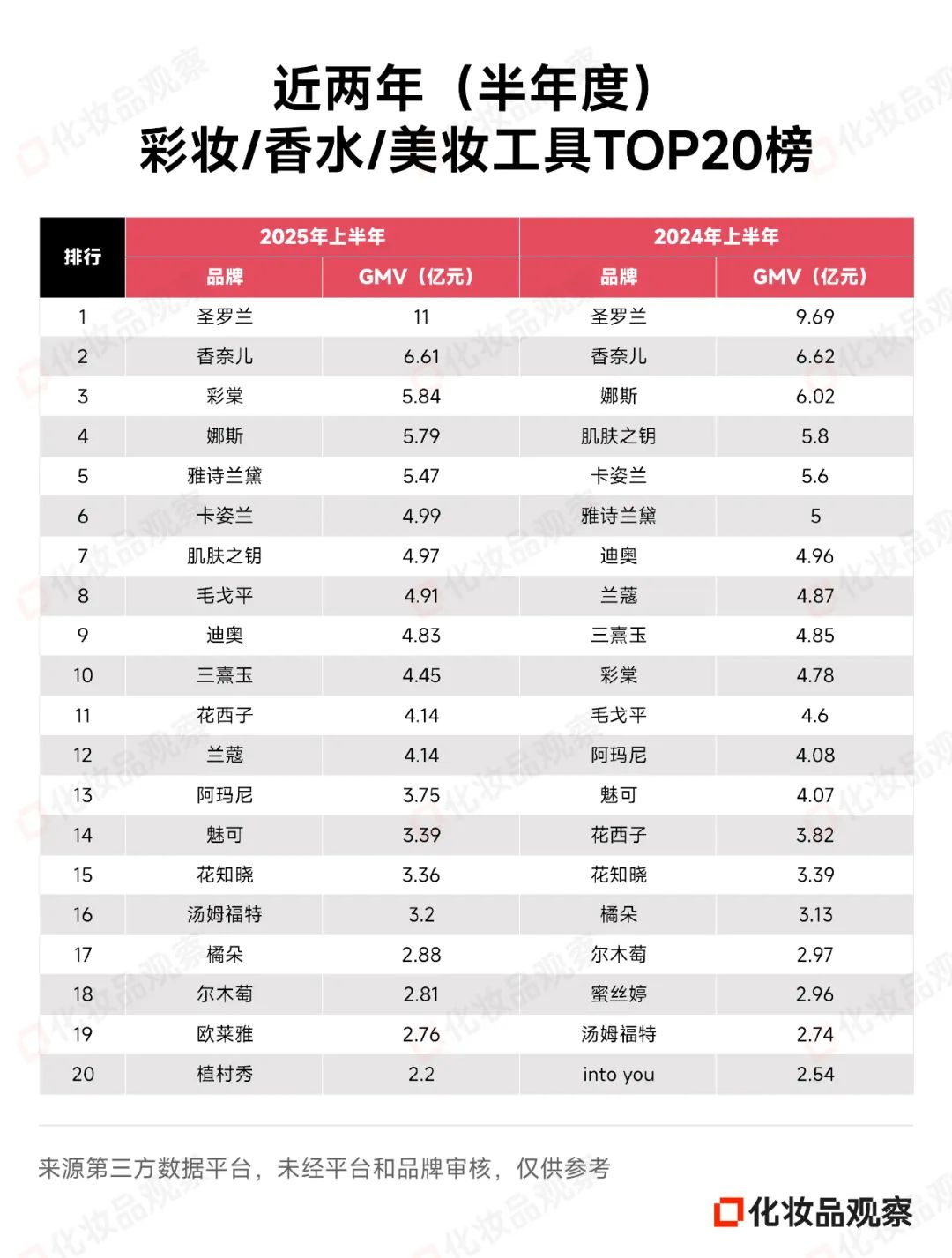 彩妆市场整体并不好过——TOP20成员里,有65%的品牌同比微跌。圣罗兰则是例外,不仅蝉联第一,且GMV从2024年上半年的9.69亿元上涨至2025年上半年的11亿元。