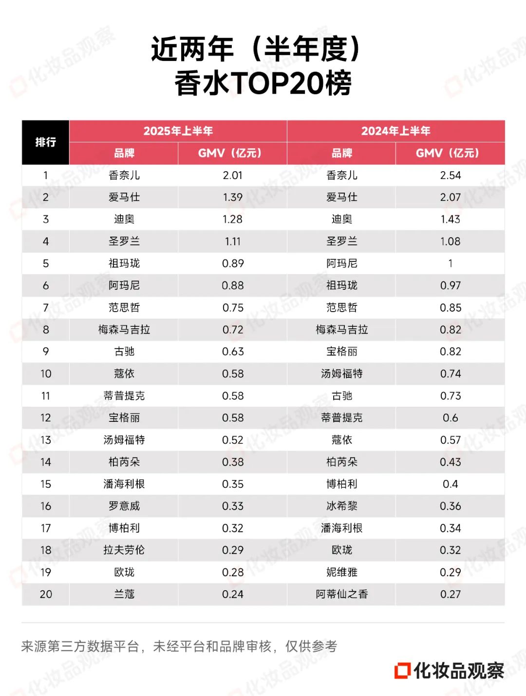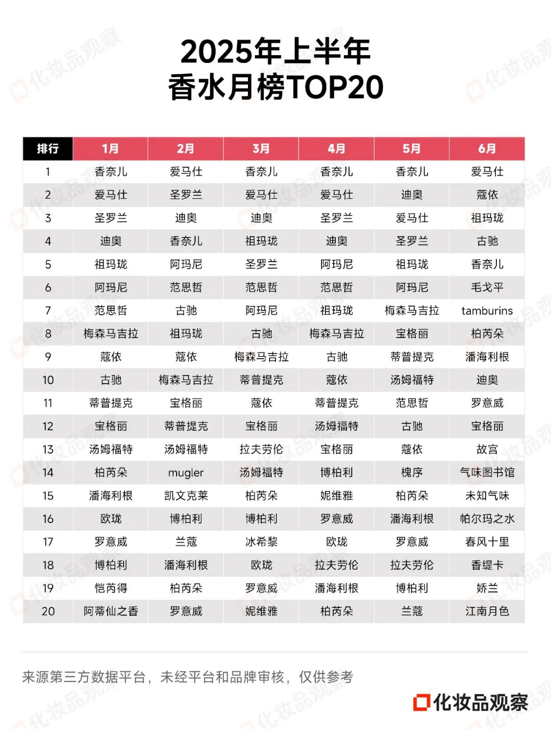 今年上半年的香水TOP20榜,基本是国际大牌的天下。值得一提的是,今年6月,毛戈平、气味图书馆、春风十里等国货进入月度TOP20榜。