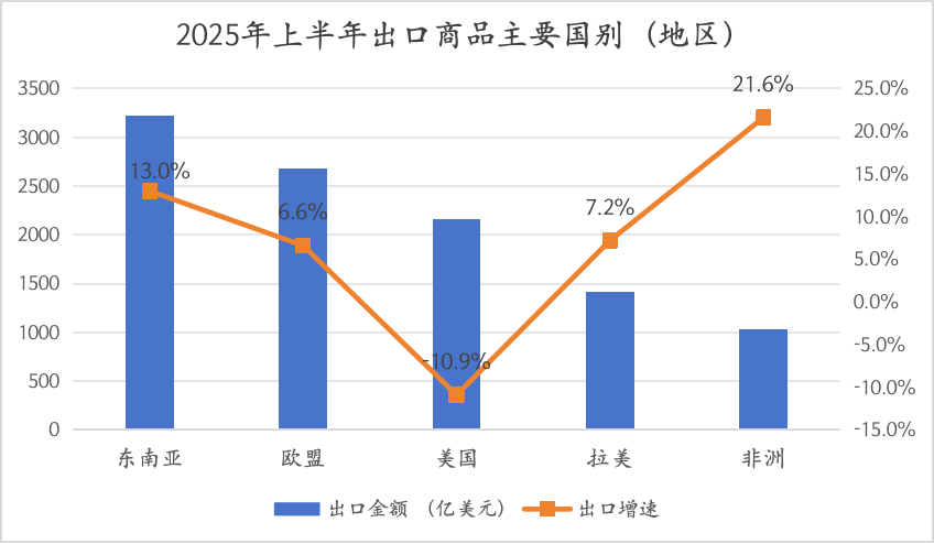海关统计显示,今年上半年,东盟、欧盟、美国是排名前三的出口目的地。其中,对东盟出口同比增长13.0%,对欧盟出口同比增长6.6%,对美国出口同比下降10.9%。