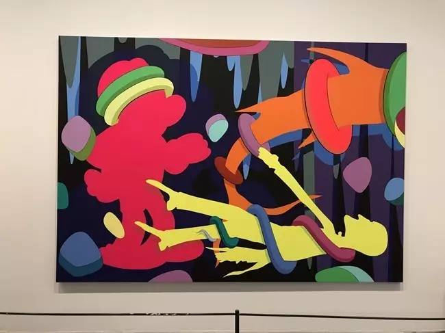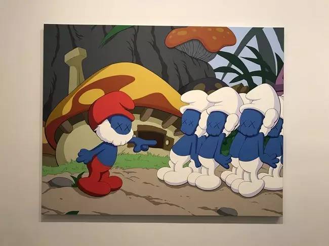 其中“老友”系列是KAWS从涂鸦转到油画的一个重要过渡。“同伴”是其第一批搪胶玩具的原型。小鬼们的小小玩具,突然放大后,就变成艺术品了?KAWS狠狠地嘲讽了一番,并模糊了高级艺术和低级艺术的界限。