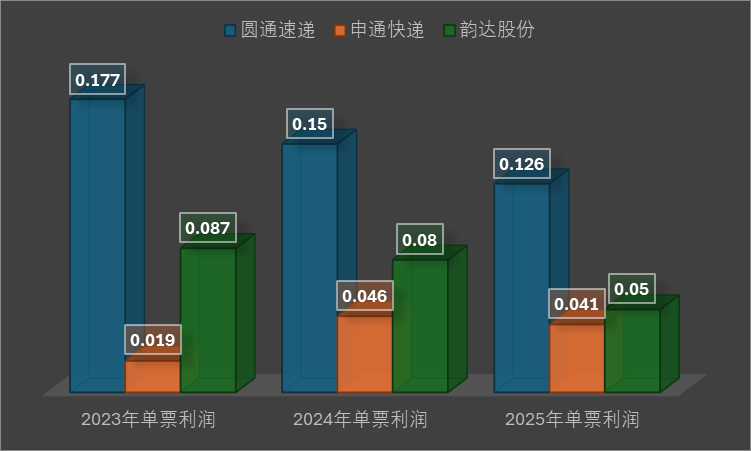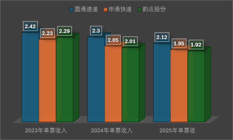 2023年至2025年,圆通速递单票收入从2.42元降至2.12元,申通快递从2.23元降至1.95元,韵达股份从2.29元降至1.92元,三家企业单票收入降幅区间在4%-12%之间。