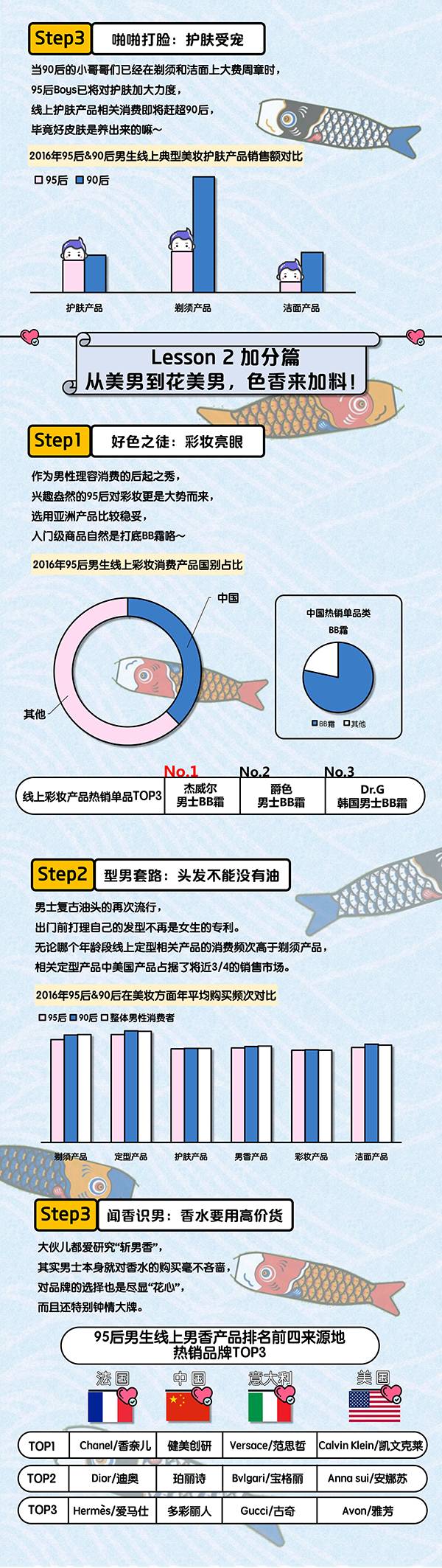 要成为名副其实的“花美男”,那就需要在基础篇之上为自己的理容加分,CBNData《报告》将加分篇分为彩妆、定型和男香三个步骤。