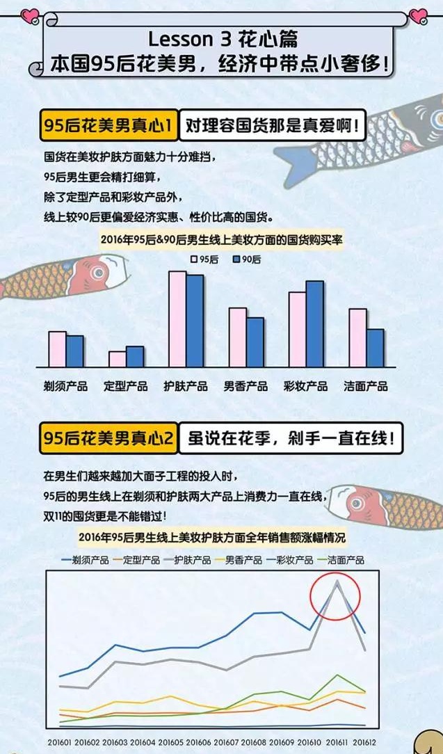 当下,在男生的购物车里发现一支润唇膏,一罐BB霜,真的没啥好吃惊的,男士们的线上美妆护肤消费出卖了他们的“爱美之心”,95后的小男生也已跃跃欲试,并且在美妆消费这件事儿上,已然超越了90后的师兄们,“花漾”之心溢于言表。