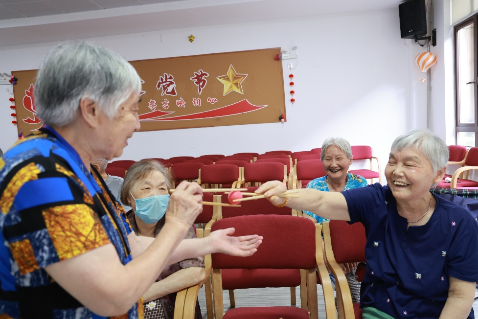 清晨的手指操、下午的拍拍操和佳木斯操,成了老人们最期待的时刻。伴随着轻快的音乐,学子们和老人们一起舒展筋骨。“25格”“蔬菜水果城市”等反应类游戏,“报纸接力传乒乓球”“筷子夹乒乓球接力”等协作游戏,也让养老社区充满欢声笑语。在夹球接力比赛中,65岁的李奶奶身手矫健,反超了略显紧张的大学生团队,赢了比赛的她像个孩子一样欢呼起来。赵奶奶在“纸杯叠叠乐”比赛中获得冠军后,高兴地说:“这些游戏既能动手又能动脑,太有意思了!”