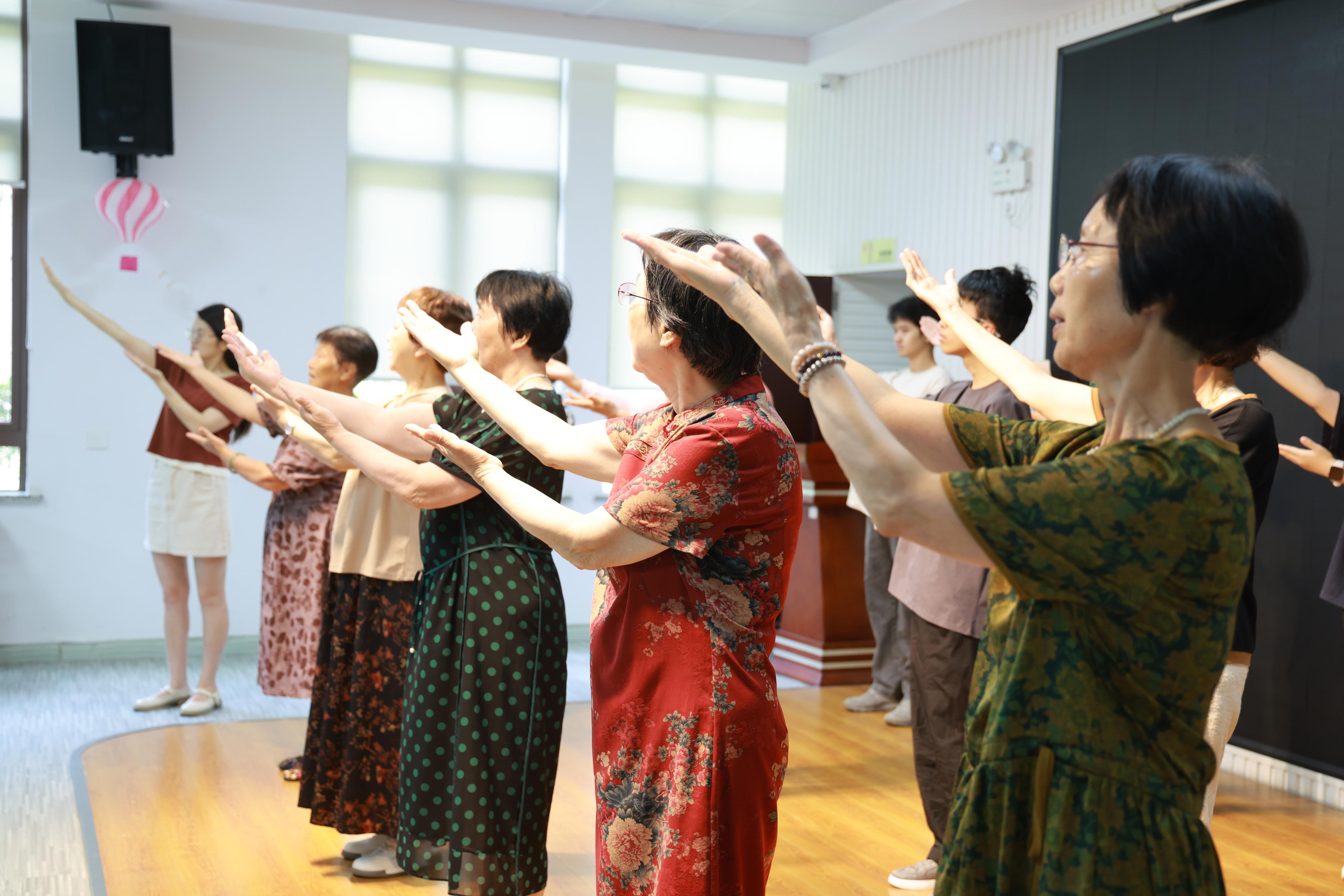 为了准备歌诗会演出,学子们向慈孝轻骑队的奶奶们虚心学习手势舞《万疆》和经典舞蹈《浏阳河》。傅奶奶耐心地指导每个动作,她笑着说:“年轻人愿意学这些传统舞蹈,我打心眼儿里高兴。”彭旭宁同学深受触动:“奶奶们练习时的专注,让我明白保持对生活的热情,才能让日子过得精彩。”