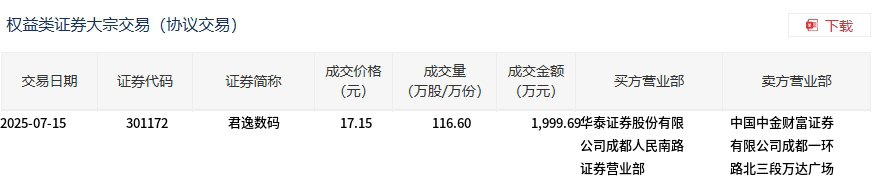 7月15日,君逸数码大宗交易成交116.6万股,成交额1999.69万元,占当日总成交额的17.47%,成交价17.15元,较市场收盘价21.4元折价19.86%。