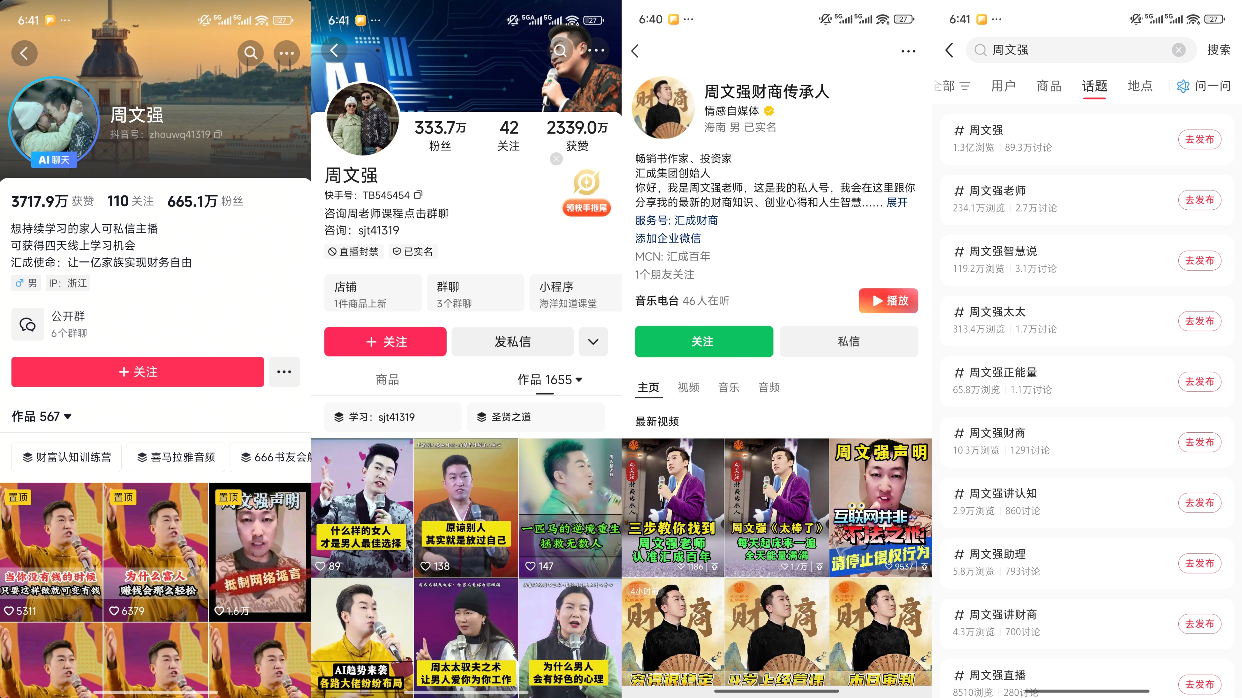 截至2025年7月,周X强的抖音主账号积累了665.1万粉丝,快手主账号拥有333.5万粉丝。在抖音平台上,周X强的多个蓝V认证账号粉丝量在10万至390万不等。其微信视频号也保持着每日更新三次的高频率。在小红书上,与“周X强”相关的话题,高达1.3亿浏览量。