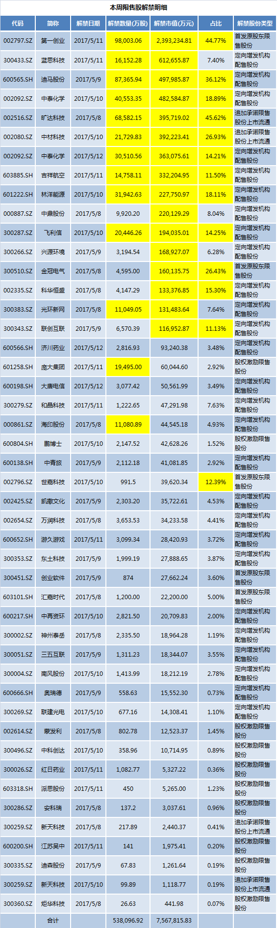 Wind资讯数据统计显示,5月8日至12日预计有45家公司、46批限售股陆续解禁,合计解禁53.81亿股。按5月5日收盘价计算,本周解禁市值合计756.78亿元。