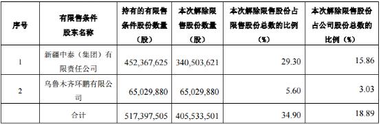 中泰化学本周将有两批限售股上市流通。第一批限售股解禁在5月10日,解禁股份4.06亿股,占总股本比例18.89%;第二批解禁日期预计在5月12日,解禁股份3.05亿股,占比14.21%。其中第一批解禁提示公告已发布,第二批解禁公告还未出,两批合计解禁市值高达85亿元。
