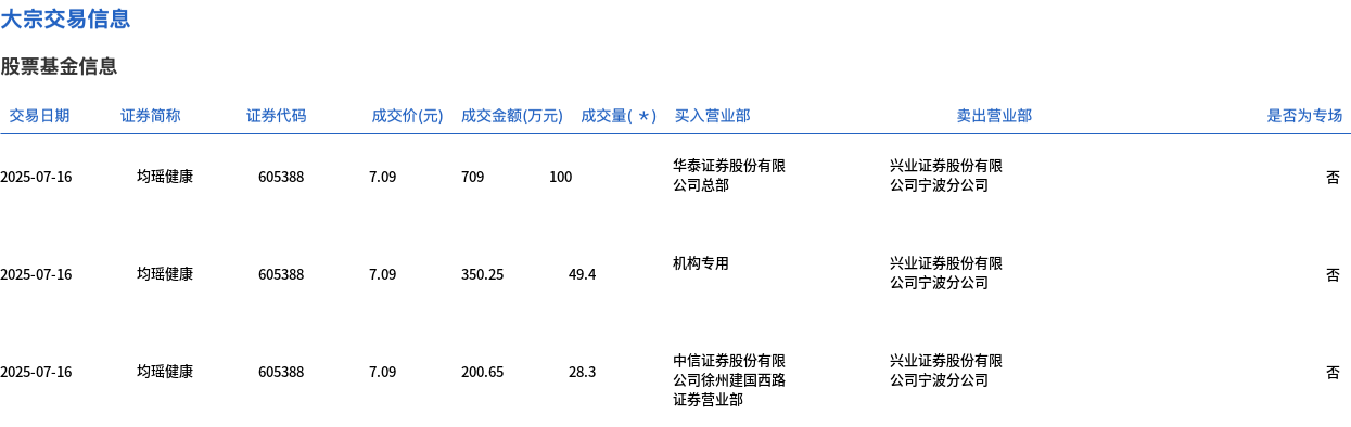 7月16日,均瑶健康大宗交易成交177.7万股,成交额1259.9万元,占当日总成交额的8.95%,成交价7.09元,较市场收盘价8.05元折价11.93%。