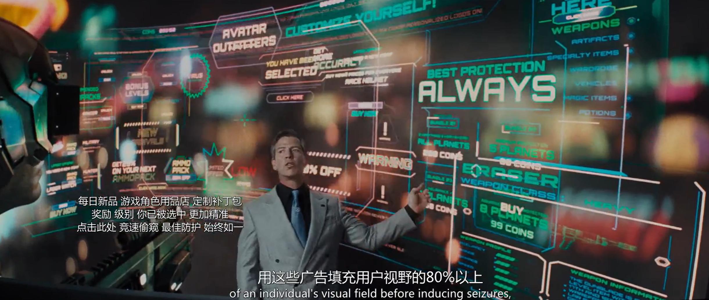 电影《头号玩家》给反派101公司设置了这样一个场景:突破平台限制,用广告轰炸用户来获取更高的商业利益,美其名曰“纯净升级”。