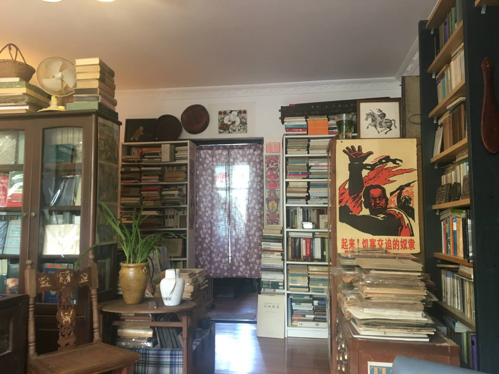 按门铃,稍后鲁毅来开门,如果再加上暗号的话,我们的接头方式或许和旧式情报人员有一拼。走进大门,却发现里面别有洞天。宽敞明亮的大厅被书架环绕,书架上都是二手书,其中不乏大部头,像是《The Engravings of Eric Grill》、还有《汉画像卷》。书柜边贴着张海报,上面写着“起来,饥寒交迫的奴隶”。