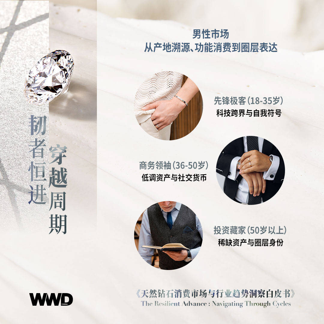 男性市场则由产地溯源、功能消费、圈层表达驱动。18-35岁先锋极客偏好科技感设计,关注电竞、潮玩等跨界圈层;36-50岁商务领袖注重投资属性与商务场景适配性,将钻石视为低调资产和社交货币;50岁以上投资藏家偏好收藏级钻石,更加关注产地伦理和公益属性。