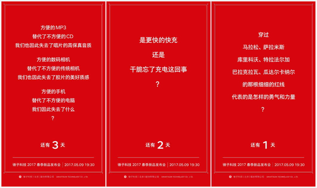 自去年10月发布M1系列后,锤子科技在产品上几乎没有发声,有消息称,新品定价千元,配备5.5英寸屏幕,高通骁龙626处理器,还有后置双摄等,为今年主流中端机水平。虽然有人判断发布会上硬件方面的惊喜并不大,但参考预热海报,相信罗永浩依旧还会在软件上有所突破,例如海报上的“胶囊”、“火枪”和“杀马特”功能,还有倒计时海报中提到的“充电”和“细细的红线”等。