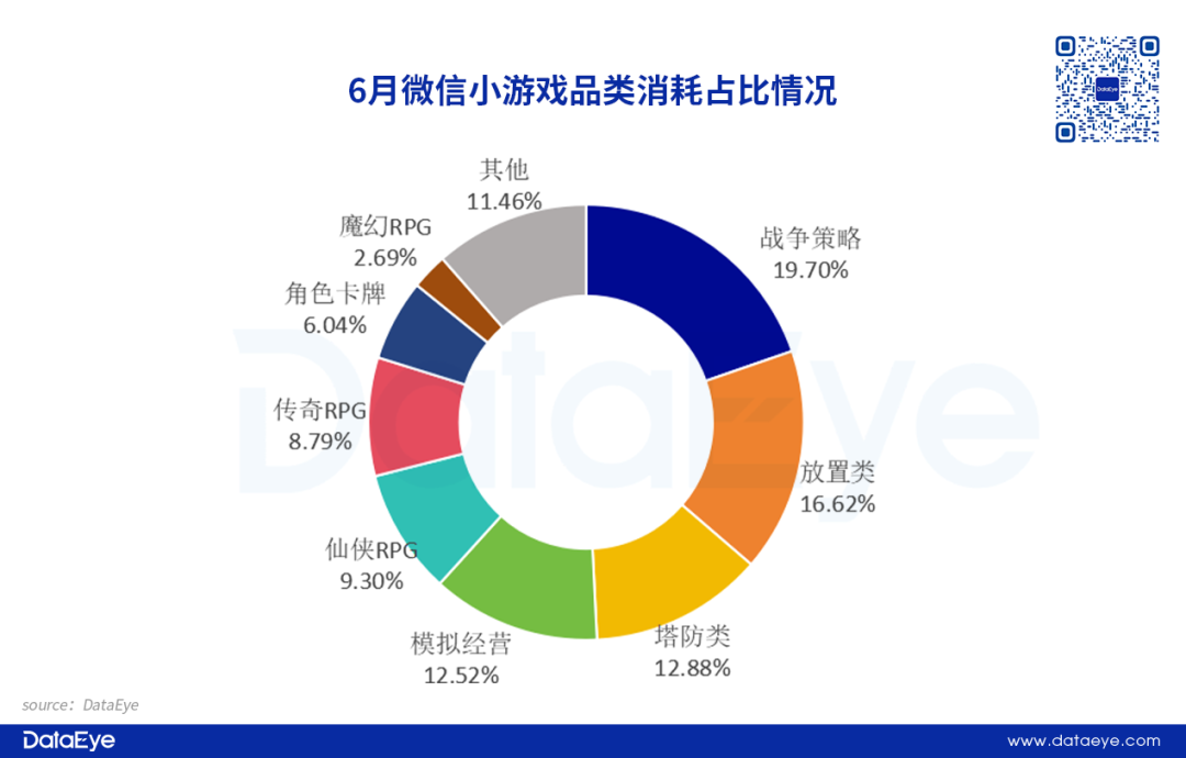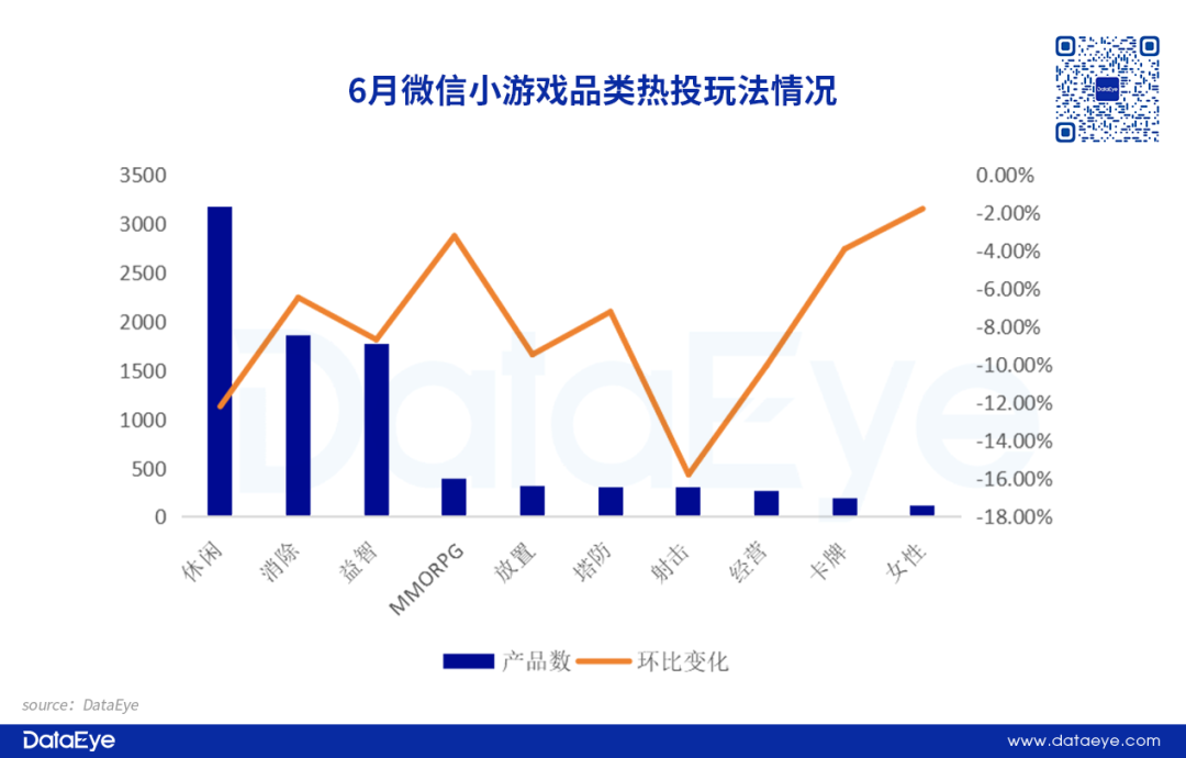 6月参投微信小游戏玩法TOP10分类,休闲排名TOP玩法第一,消除排名第二,益智类排名第三。
