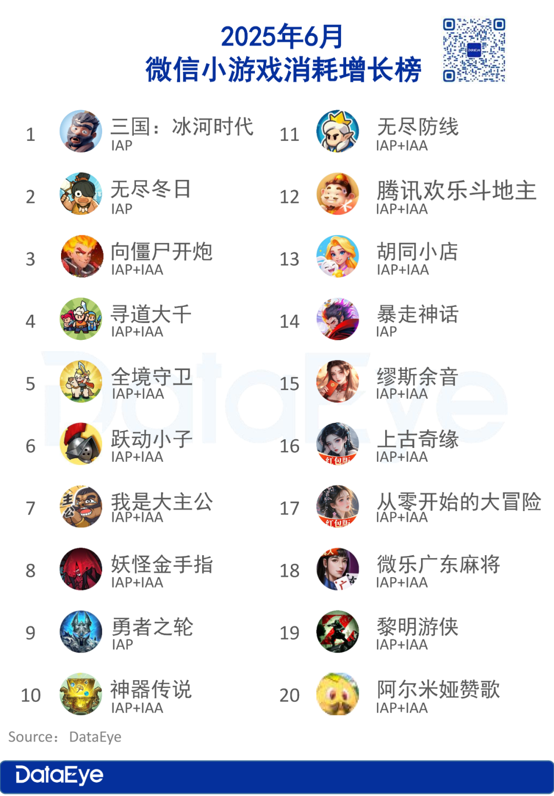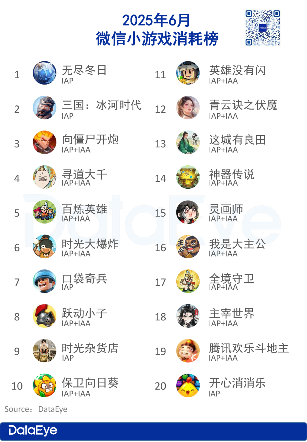 消耗榜头部(1-10名):《无尽冬日》继续排名月度消耗榜,《三国:冰河时代》在6月消耗强势,提升4个排名升至月度消耗榜第二名,以至于《向僵尸开炮》《寻道大千》《百炼英雄》均下滑了一个位置。