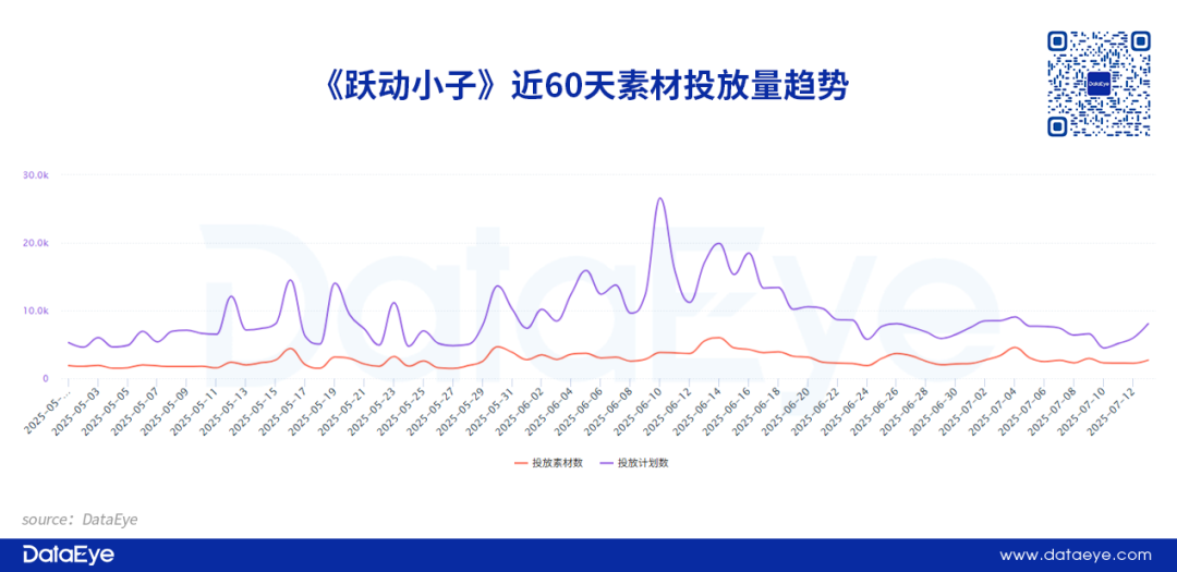 《跃动小子》排名上升5位,排名月度消耗榜第8名,也是该产品今年首次进入TOP10。而在微信小游戏畅销榜方面,《跃动小子》已经超过《寻道大千》成为赛道领头羊。DataEye-ADX投放数据显示,《跃动小子》6月素材投放量稳定,单日投放素材峰值超过6000条,而单日投放计划数超过2.5万组。