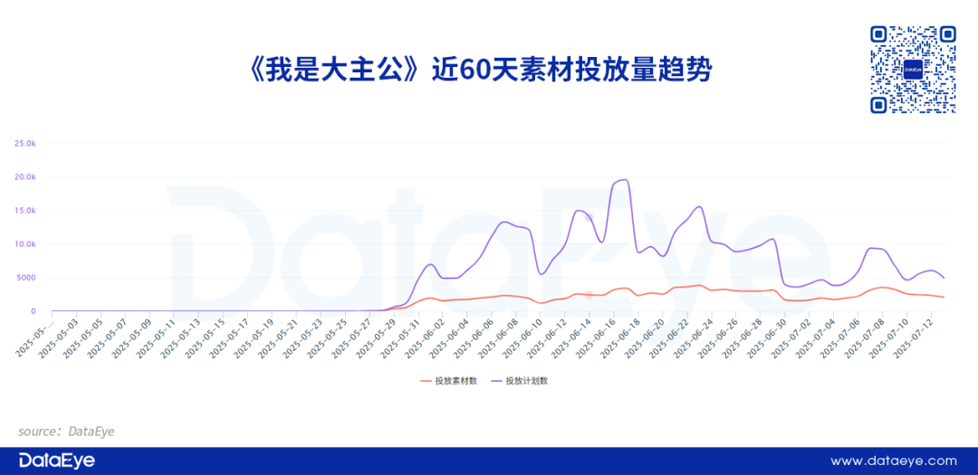 冰川网络《我是大主公》是一款三国题材的塔防类游戏,该游戏对靶心Like的设定进行了微创新,同时增加了英雄与兵种的召唤策略。DataEye-ADX投放数据显示,《我是大主公》在5月底开始进行效果广告投放,6月呈现持续提升的态势。