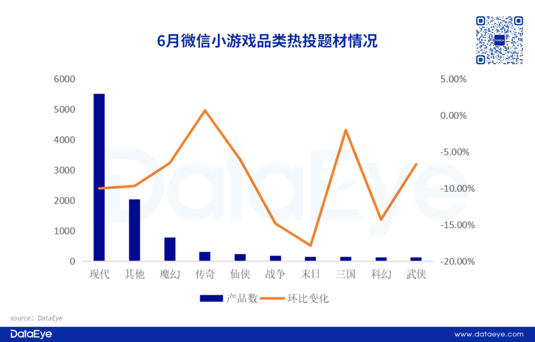 参投微信小游戏题材TOP10分类中,现代、其他、魔幻排名前三。传奇题材成为TOP10中投放游戏数唯一增长的题材,其次是三国题材是降幅最少 的产品。对比来看,末日、战争题材在投游戏数下滑明显。