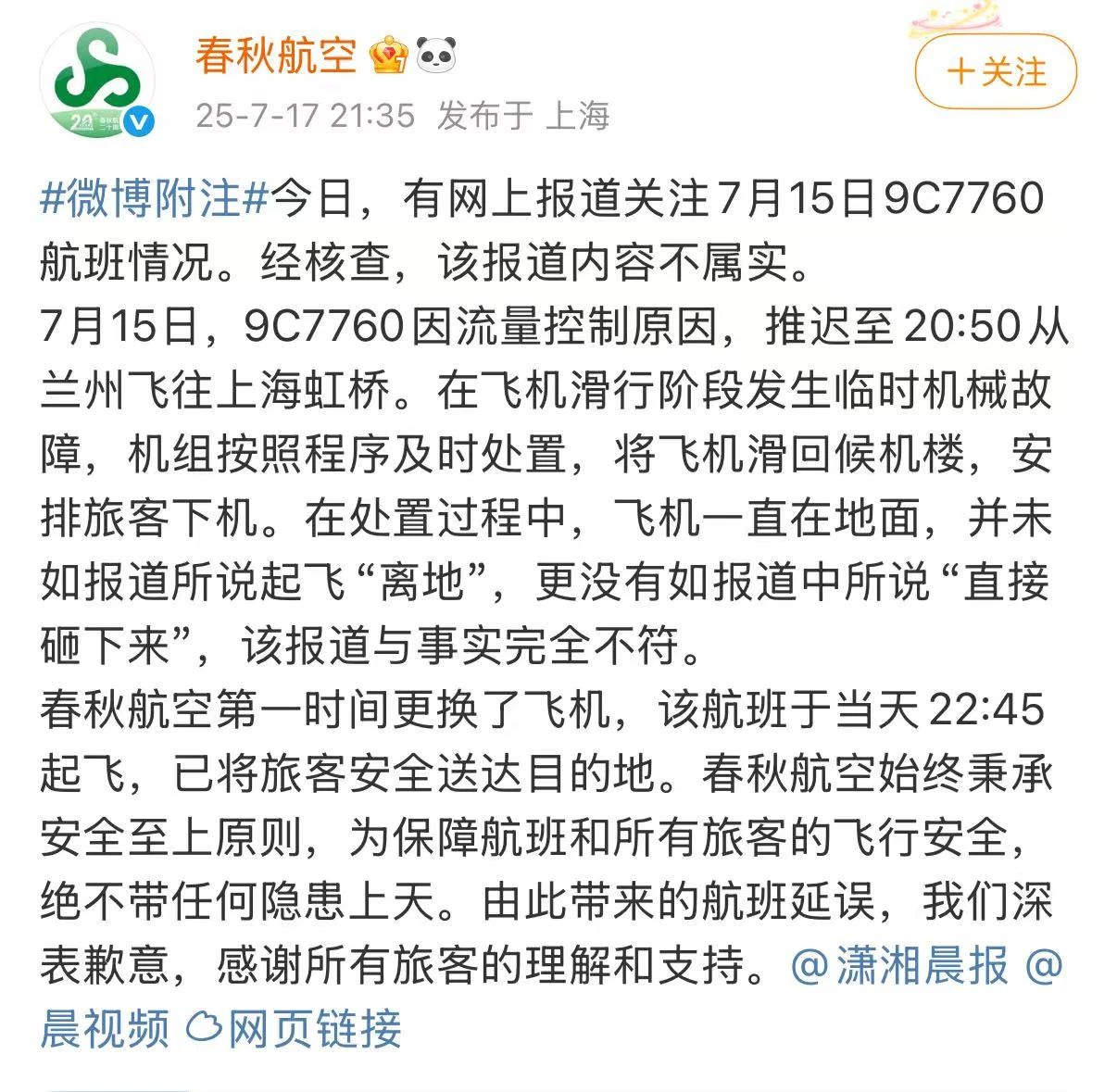 7月17日晚,春秋航空官方微博发布说明:今日,有网上报道关注7月15日9C7760航班情况。经核查,该报道内容不属实。