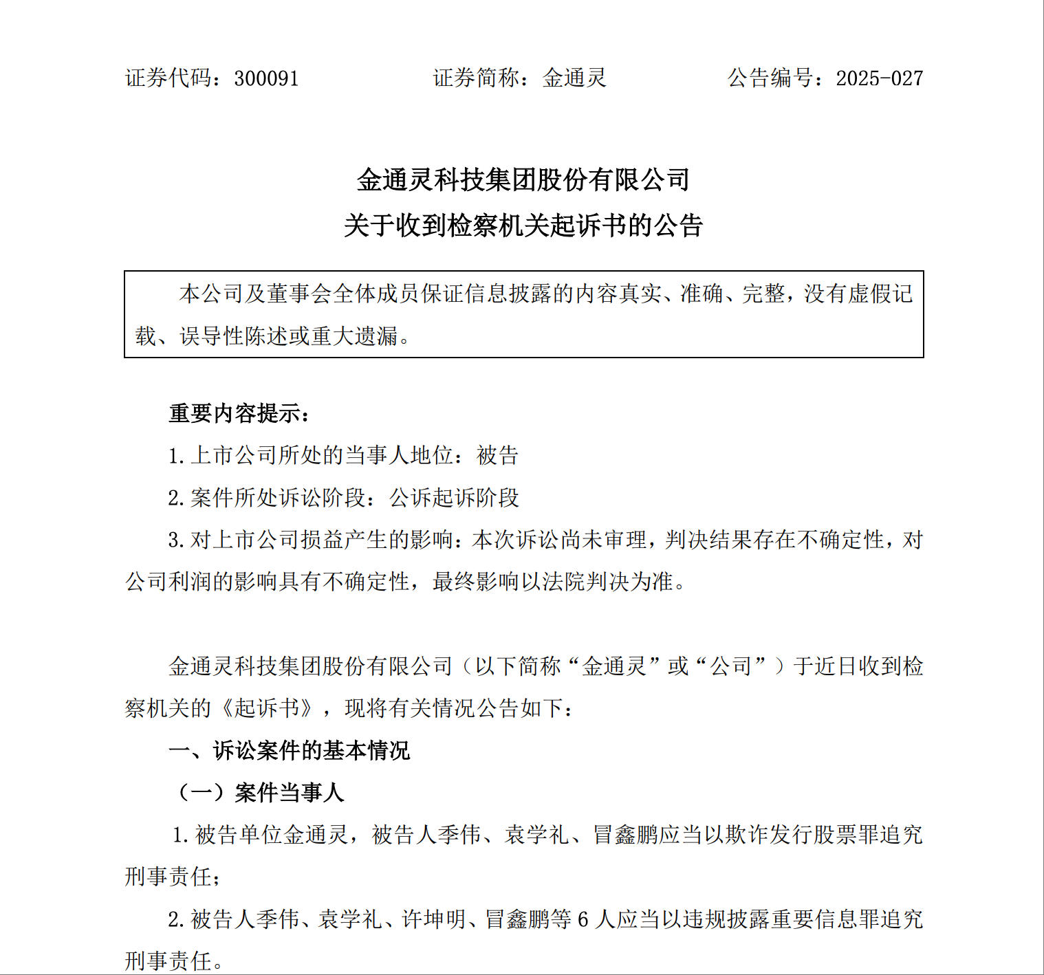 昨日晚间,金通灵发布公告称,公司及6名高管因涉嫌欺诈发行股票罪、违规披露重要信息罪被检察机关提起公诉。根据起诉书,因连续六年财务造假,金通灵和公司时任董事长兼总经理季伟、时任财务总监兼董事会秘书袁学礼、监事及财务部部长冒鑫鹏应当以欺诈发行股票罪追究刑事责任,前述三名负责人及总经理助理许坤明等共计6人应当以违规披露重要信息罪追究刑事责任。