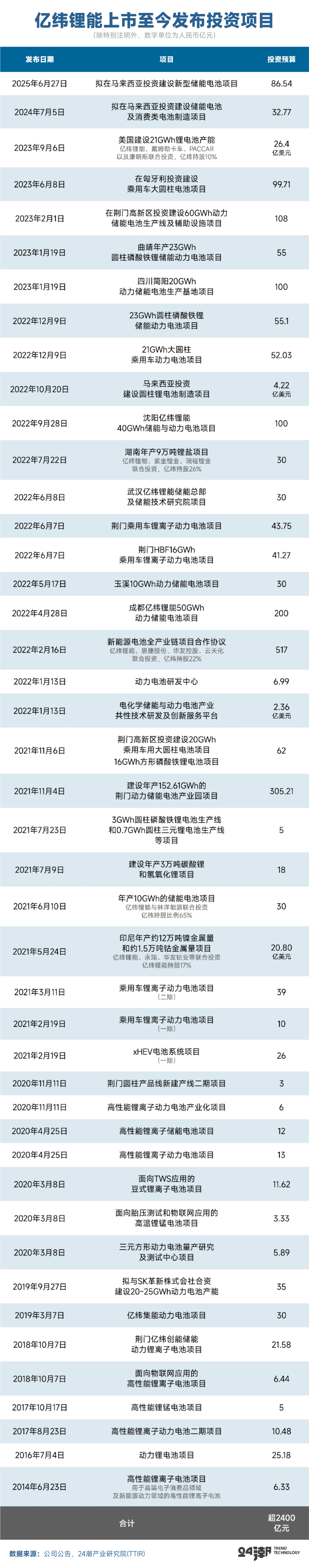 据24潮产业研究院统计,2014年至今,亿纬锂能约公布了44个超级重大工程(投资规模在亿元以上),总投资预算超2400亿元,投资领域涵盖动力电池、储能电池、钴镍、碳酸锂等。