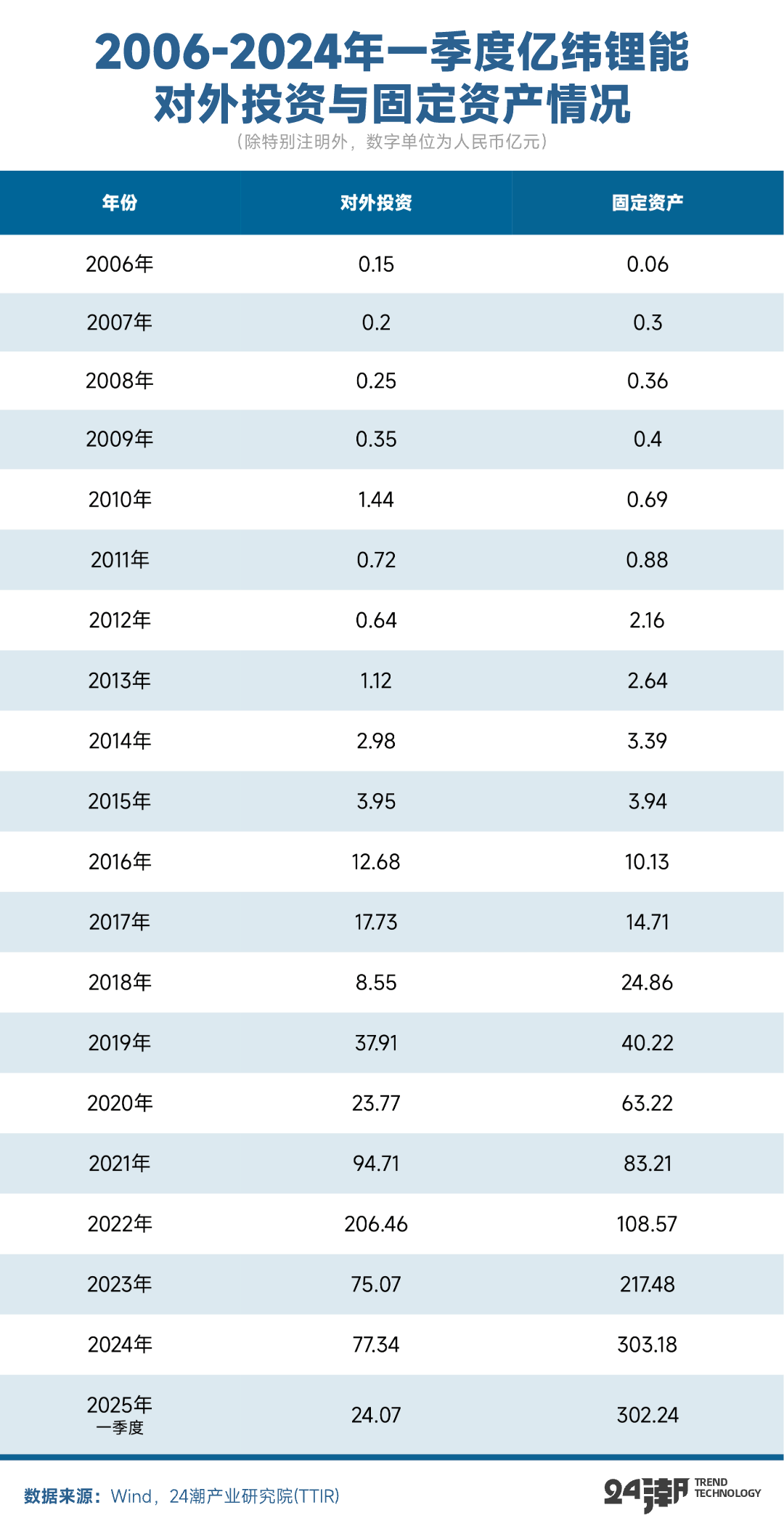 不止于战略,亿纬锂能也是个强力的行动派,据24潮产业研究院(TTIR)统计,过去19年多时间(2006年-2024年及2025年一季度)合计对外投入(现金流)590.09亿元。尤其2021年以来,亿纬锂能明显加速了扩张的步伐,2021年-2025年一季度,4年多合计对外投资达477.65亿元,是过去十五年的(2006年-2020年)4.25倍。