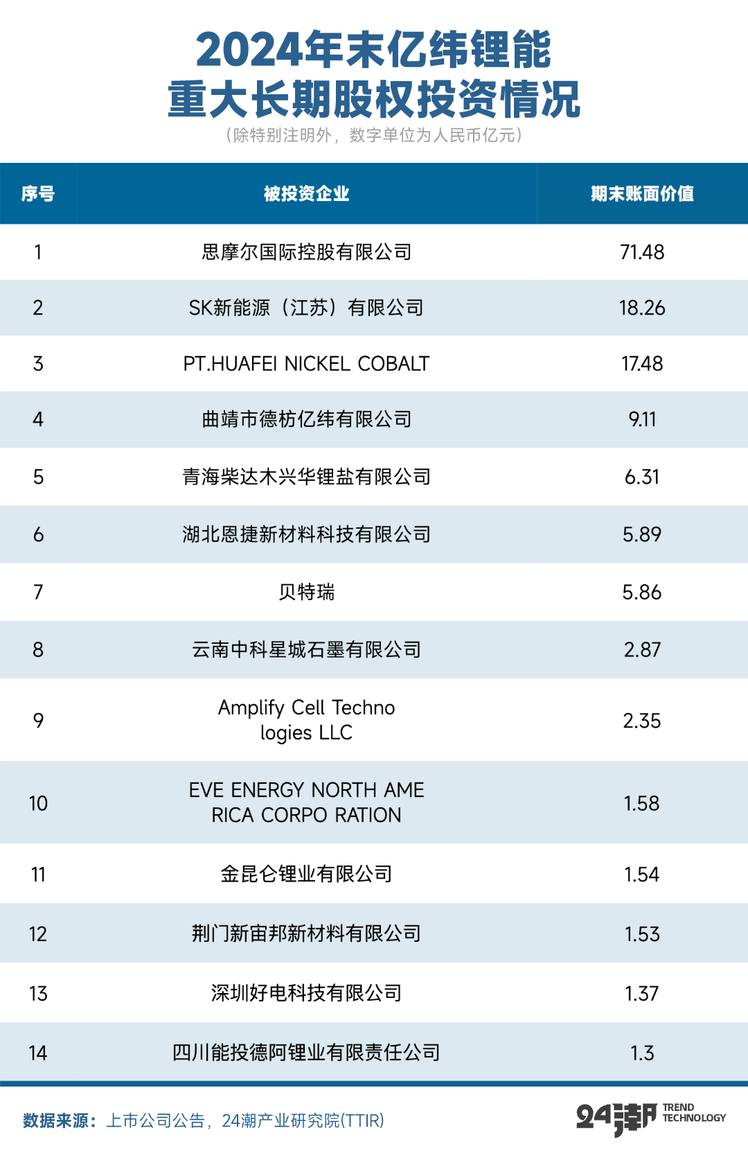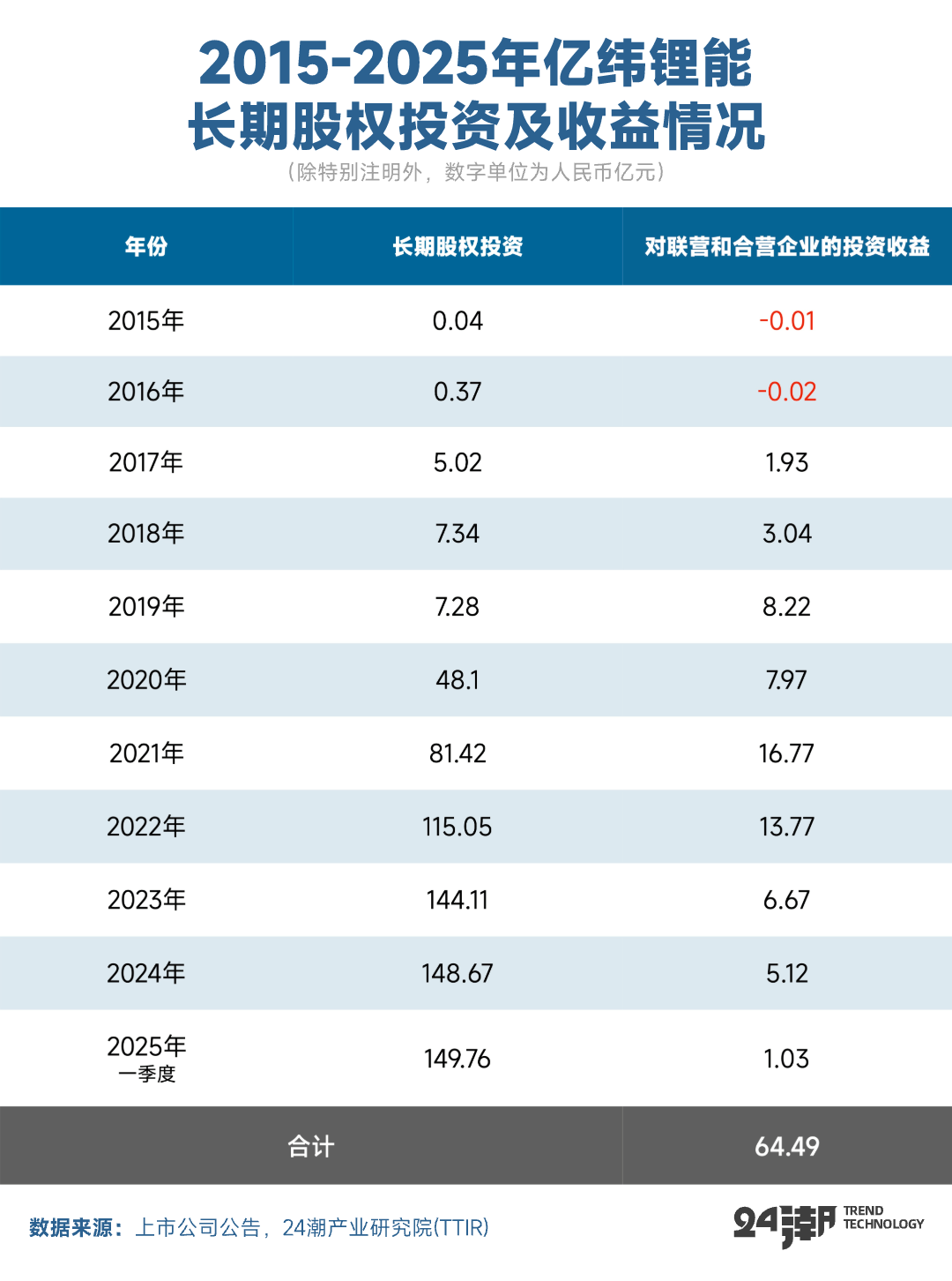 据24潮产业研究院统计,截止2025年3月末,亿纬锂能对外长期股权投资规模达149.76亿元,过去10年多时间(2015年-2025年一季度)合计为亿纬锂能贡献了64.49亿元的投资收益。