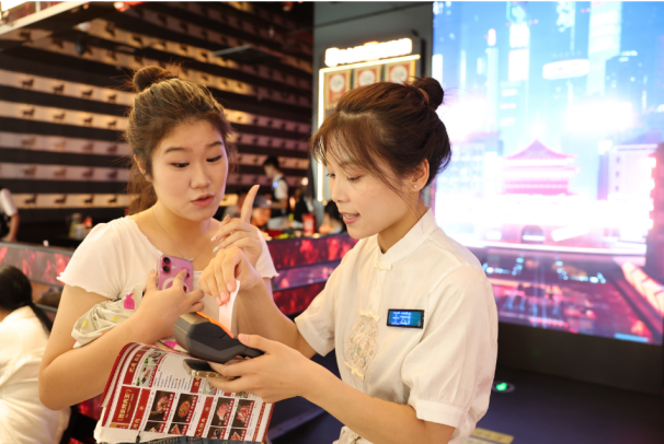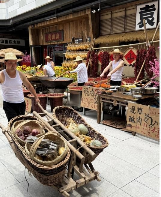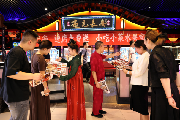 袁山山重庆火锅(大明宫店)里,刚参加完中考的刘佳打卡剧中“牡丹”同款“锦绣芳华”套餐,还抽中心仪文创,其父母则惊喜见证偶像刘仪伟现场作诗“热辣江湖多少事,饮尽风流卧长安”;13公里外的小寨赛格,火炉旁烤肉店里,王子涵拉着男友与城墙元素布景、剧中同款烤肉合影……