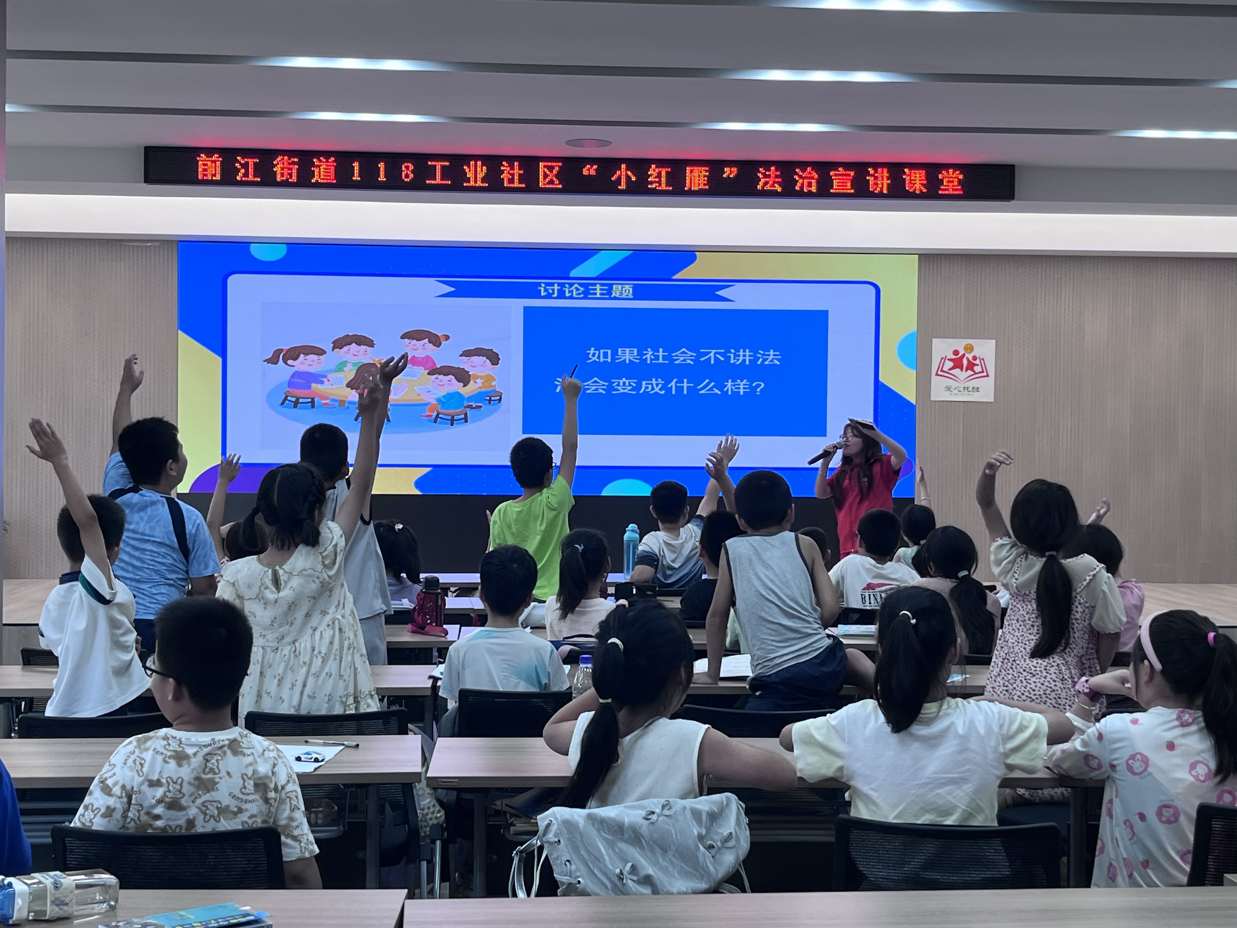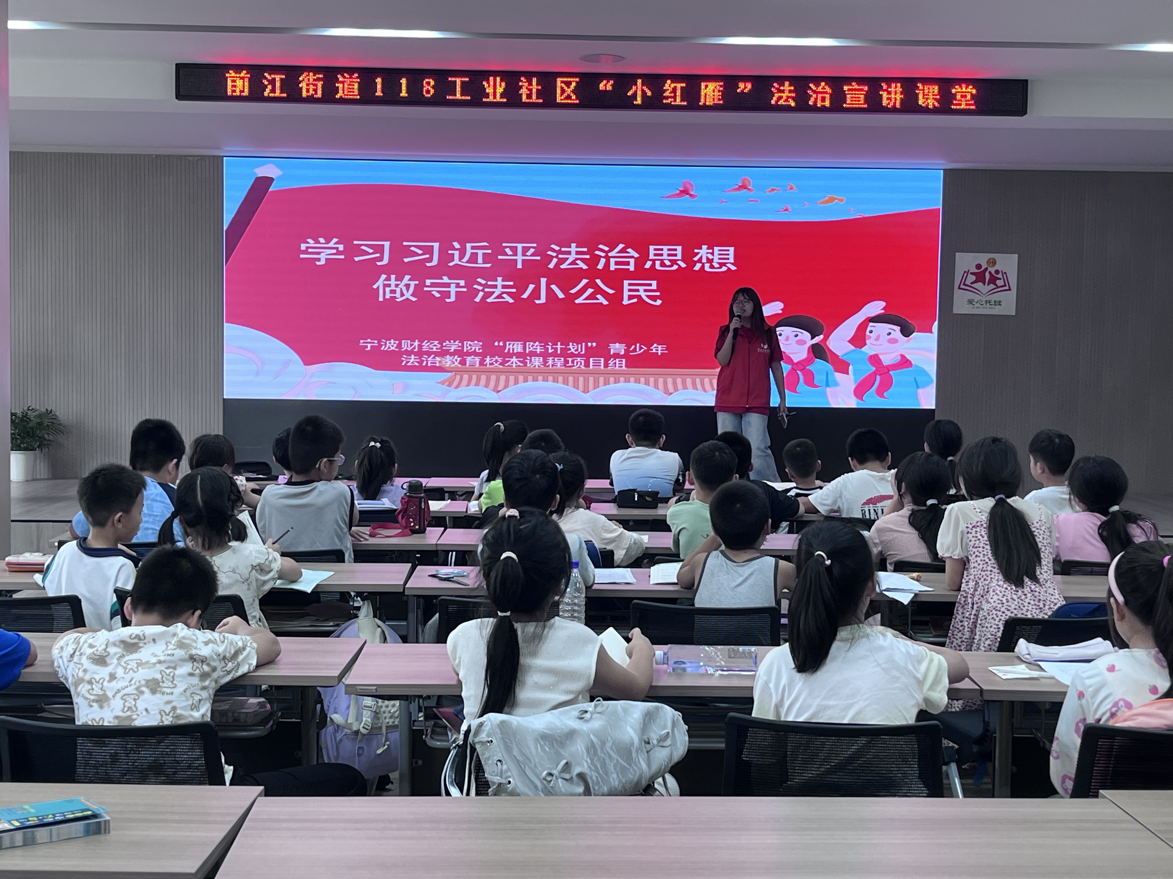 江北118工业社区聚集了建新底盘、邦贝科技等多家企业,既有深耕出口的成熟企业,也有快速成长的中小企业,这里生活着大量企业职工子女。随着企业发展加速,“海外反垄断合规”“劳动纠纷预防”“跨地区用工政策不统一”等法治痛点逐渐凸显;而暑期里,职工子女“看护难”的同时,法治启蒙教育也成了家长们的期盼。人手紧张、需求多元,让社区在法治服务精细化上有些力不从心。 基于118工业社区法治赋能的实际需求,宁财院“青法企航”实践团充分发挥法学、社会工作等专业优势,聚焦“法治助企降本增效+青少年法治课堂”双主线,开展了一场贯通企业与童心的实践行动。团队指导老师滕秋玲介绍说,从7月14日开始,团队就兵分多路开展实践,一路走进车间,与建新底盘、摩多巴克斯、腾辉等企业负责人围坐交流并开展实地调研,就相关企业海外反垄断风险点评估、用工激增法律问题等提出对策建议,并积极宣传法律咨询途径,帮助企业员工从‘事后找帮助’变‘事前能预防’,更好维护自身权益;另一路同学则化身‘法治宣讲员’,走进‘小红雁公益课堂’,通过哪吒动画等为当地社区的70多名‘小候鸟’们讲解法律知识,并通过制作法治粘土手工“獬豸”形式,让法治种子扎根孩子们心里。