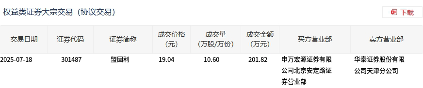 7月18日,盟固利大宗交易成交10.6万股,成交额201.82万元,占当日总成交额的0.42%,成交价19.04元,较市场收盘价21.24元折价10.36%。