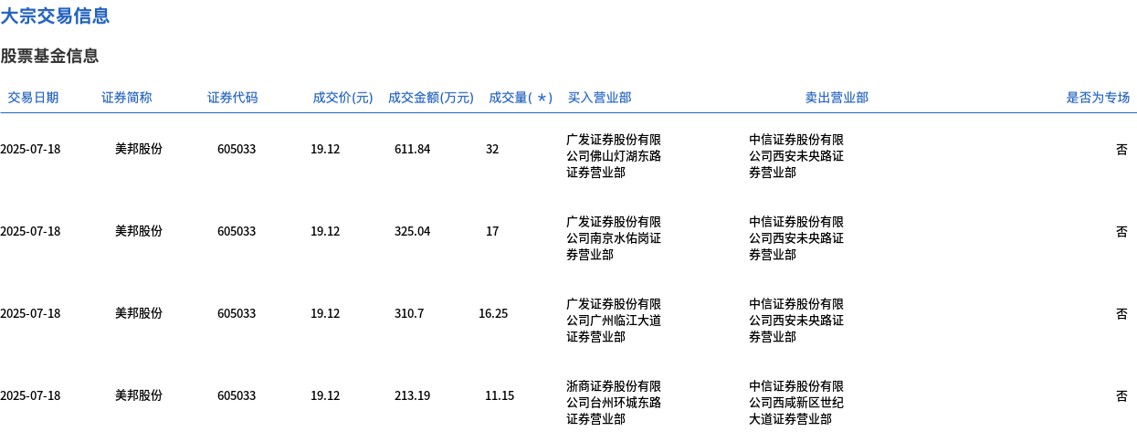7月18日,美邦股份大宗交易成交76.4万股,成交额1460.77万元,占当日总成交额的23.89%,成交价19.12元,较市场收盘价23.36元折价18.15%。