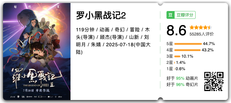 在电影上映后,《罗小黑战记2》的豆瓣评分来到了8.6分,是截至目前今年华语最高分的动画电影和院线电影。这意味着电影后续票房拥有更长期的口碑效应,而罗小黑的大电影也算是实现了从0到1,从1再到2的过程。