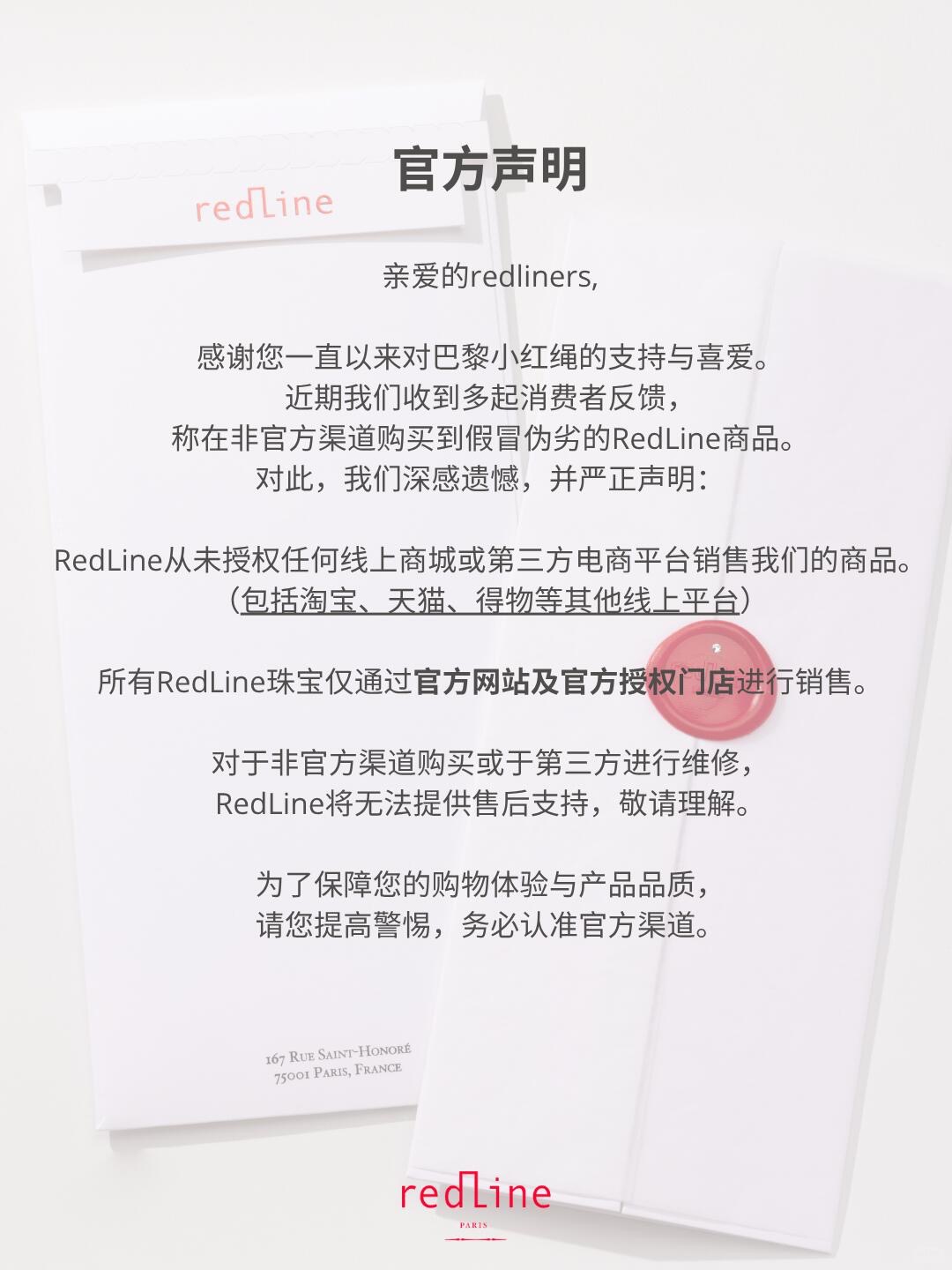 法国珠宝品牌Redline Paris近日在官方社交媒体账号发布“严正声明”,称该品牌仅通过官方网站及官方授权门店进行销售,“从未授权任何线上商城或第三方电商平台销售我们的商品(包括淘宝、天猫、得物等其他线上平台)。”