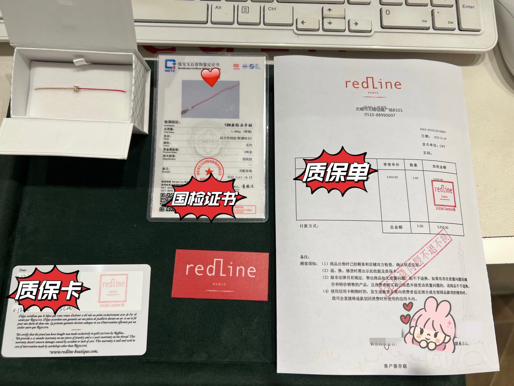 Redline无锡恒隆官方授权店的店员Lucky告诉以消费者身份询问的界面新闻记者,在中国售出的专柜商品一定包含三份文件,分别为一张质保卡、一份质保单和国检证书。而陈欣怡从“redLine(天猫)旗舰店”购得的商品仅有一张质保卡。