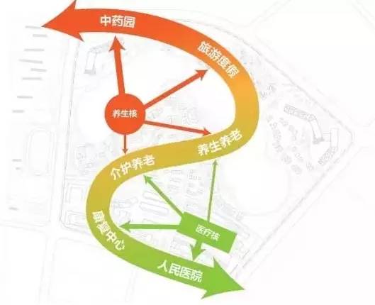 养生核+医疗核:每个组团的正负两极根据需要定位到与两核的关系,两种需求独立运行不交叉。各类细分后的养老产品依据自身对两个核心服务的依赖程度进行规划落位。