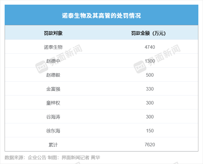 诺泰生物当前信披的罚款总额达7620万元,几乎是近一年内A股医药上市公司中被罚款最多的公司,这也使得该起案例备受关注。