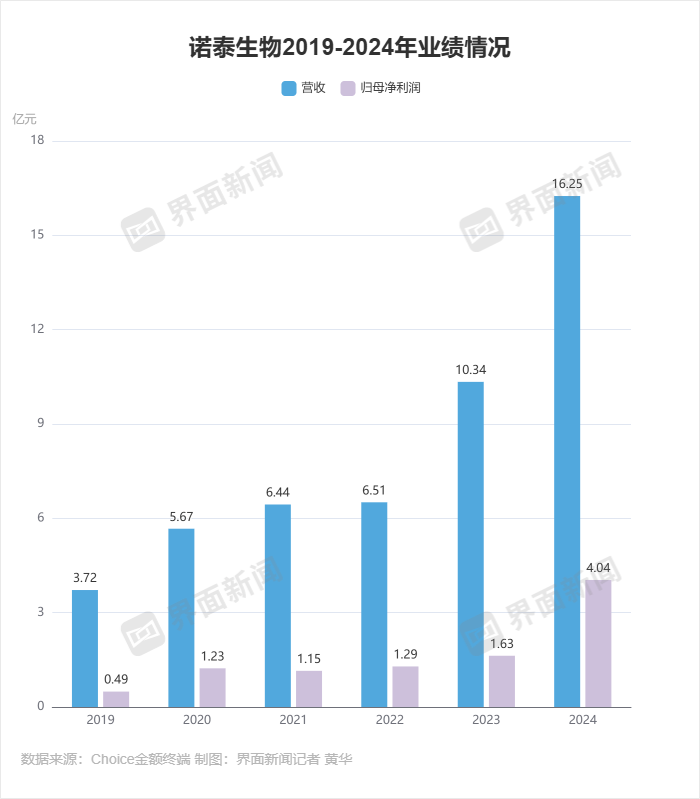虽然目前因为信披造假,诺泰生物被实以重罚,但公司也在公告中表示,企业各项生产经营活动均在正常有序地开展。从业绩上来看,诺泰生物近几年发展不错。在2019年-2024年期间,企业营收从3亿元突破至16亿元;同一时期,企业的归母净利润也在持续提升(如下图)。