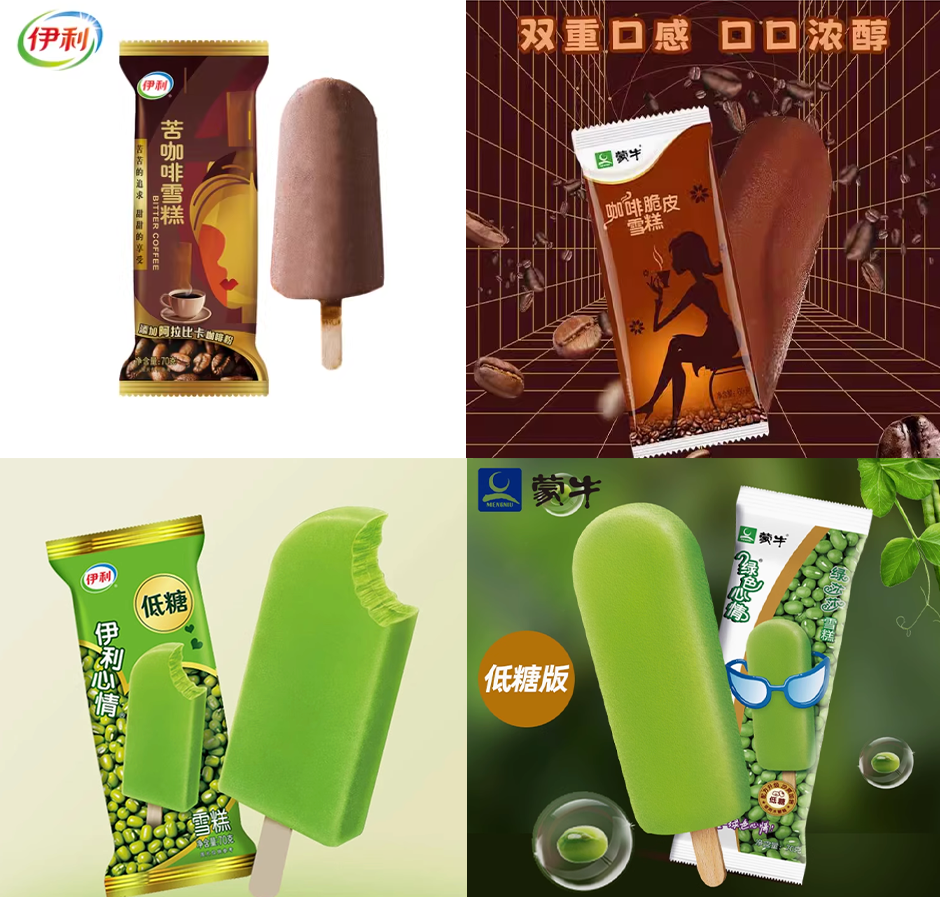 除此之外,冰品研发师们还要关注竞品厂商在冰柜里放了什么品,自家品牌有没有能与之对打的。博主@奶牛小哞曾发帖对比伊利和蒙牛的雪糕品类,发现两家大厂的冰品类别十分相近,“如同蛇一样缠绕对方”。比如咖啡口味,伊利有“苦咖啡”,蒙牛有“咖啡脆皮”;绿豆口味,蒙牛有“绿色心情”,伊利有“伊利心情”等等。
