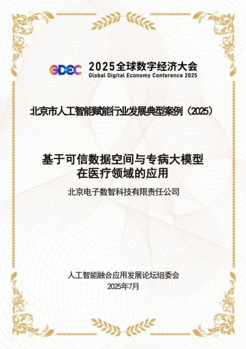 《北京人工智能赋能产业发展典型案例》则聚焦人工智能技术在各产业领域的实际应用与落地成果,旨在挖掘并推广一批能有效破解行业痛点、助力产业高质量发展的典型实践。此次北电数智“基于可信数据空间与专病大模型在医疗领域的应用”获评该经典案例,是产业对“医疗可信数据空间”创新成果的认可,更是对北电数智在医疗与人工智能融合领域技术实力和实践价值的肯定。