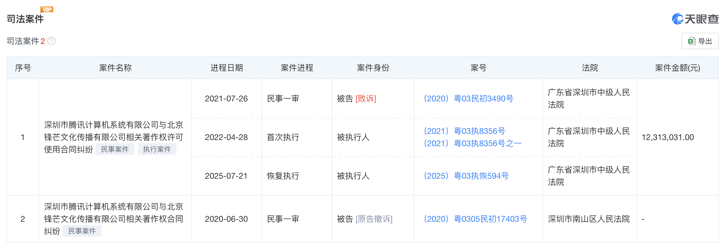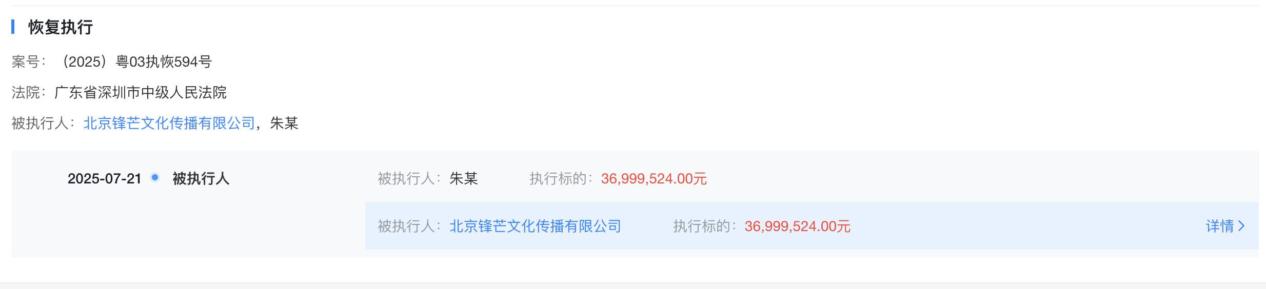 7月22日,界面新闻从天眼查App获悉,知名编剧柴鸡蛋(本名朱文娇)担任法定代表人的北京锋芒文化传播有限公司(以下简称“锋芒文化”)新增一则恢复执行信息,执行标的约3699.9万元,申请执行人为深圳市腾讯计算机系统有限公司(以下简称“腾讯”),案由系著作权许可使用合同纠纷。